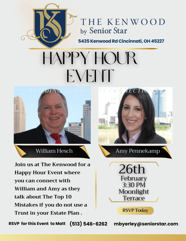 You are invited to join William & Amy for a casual Happy Hour where we will break down the Top 10 Mistakes people make when they don’t use a Trust in your Estate Plan.
